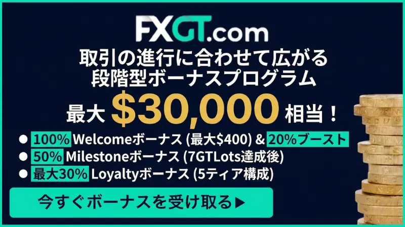| 5位 | FXGT![]() 詳細を見る | ▶︎100%Welcomeボーナス+20%ブースト (最大400ドル) ▶︎50%Milestoneボーナス (最大700ドル) ▶︎最大30% Loyaltyボーナス (最大28,900ドル)) 口座開設・入金する▶︎ |