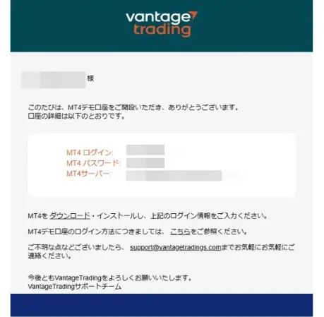 デモ口座のMT4にログインするための情報が書かれたメールが届いています。Vantage Tradingのデモ口座はMT5でも利用できますが、最初に自動で登録されるのはMT4となっています。